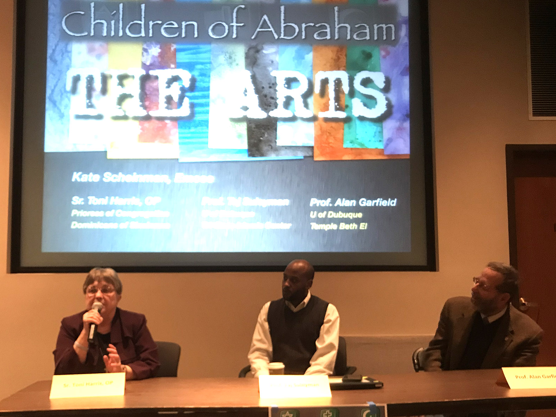Pictures from our 02-21-19 conversation at the University of Dubuque. Our topic: The Arts. One of our few conversations with pictures (maybe that's why all the cookies, tea and coffee disappeared so quickly). Presenters were: Kate Scheinman (Emcee), Sr. Toni Harris (Sinsinawa), Prof Taj Suleyman (Tri-State Islamic Center), and Prof Alan Garfield (Temple Beth El).