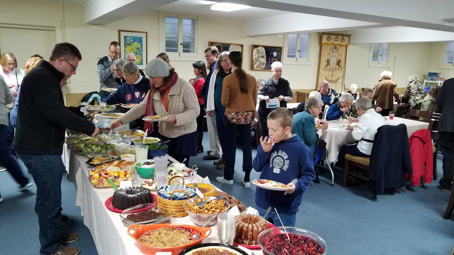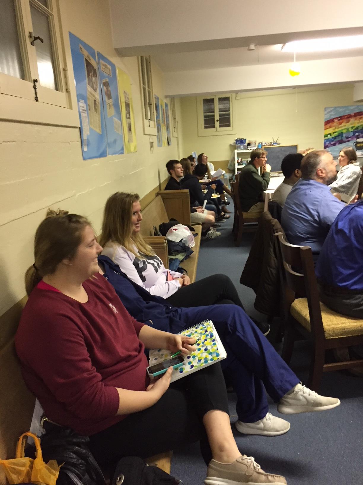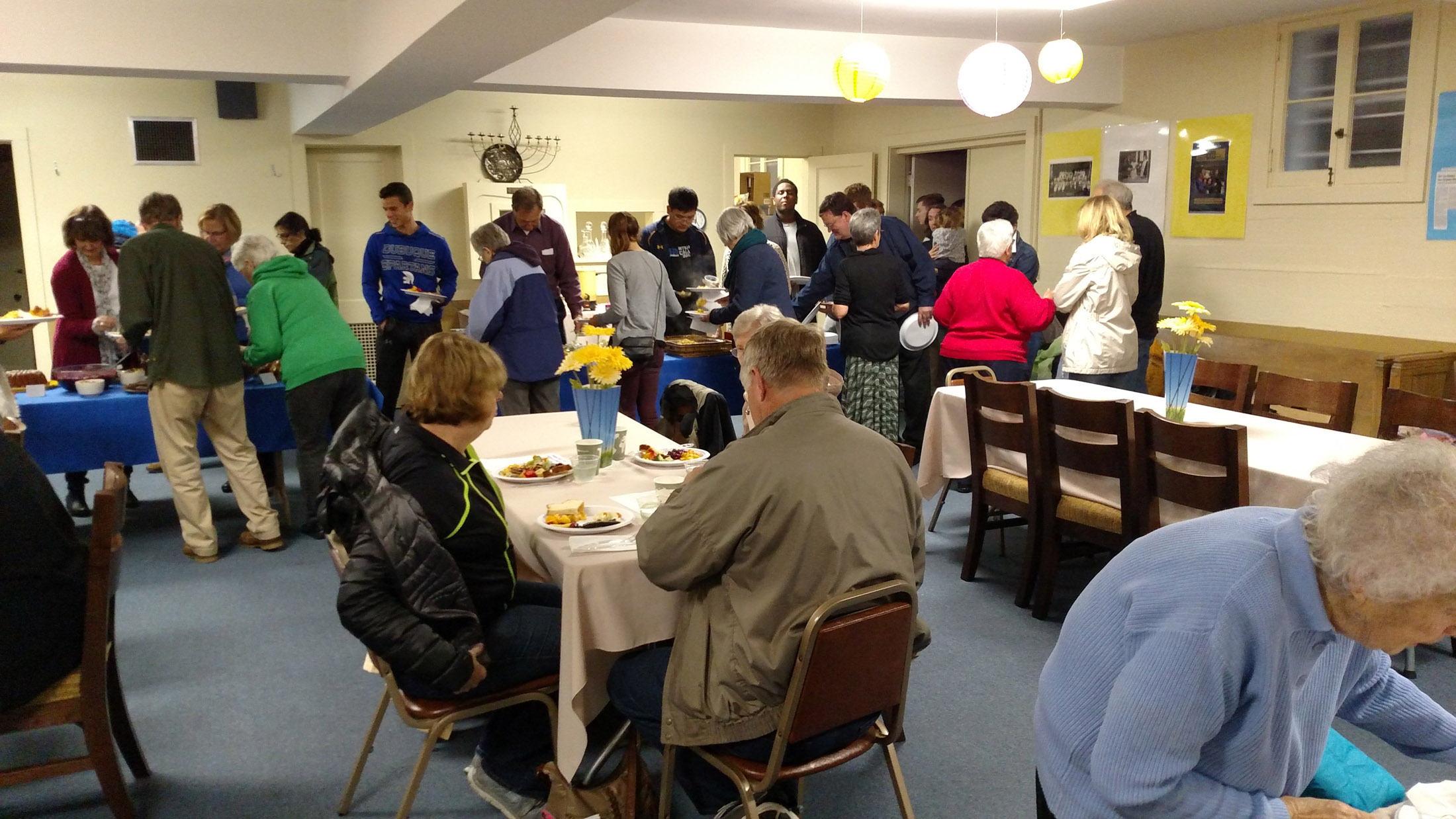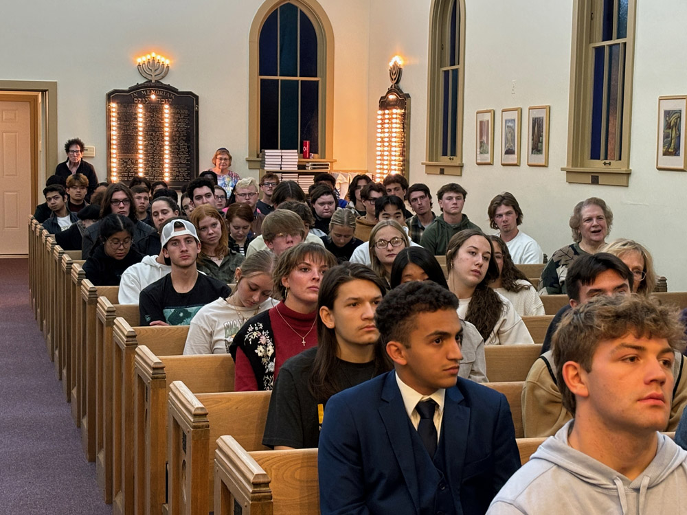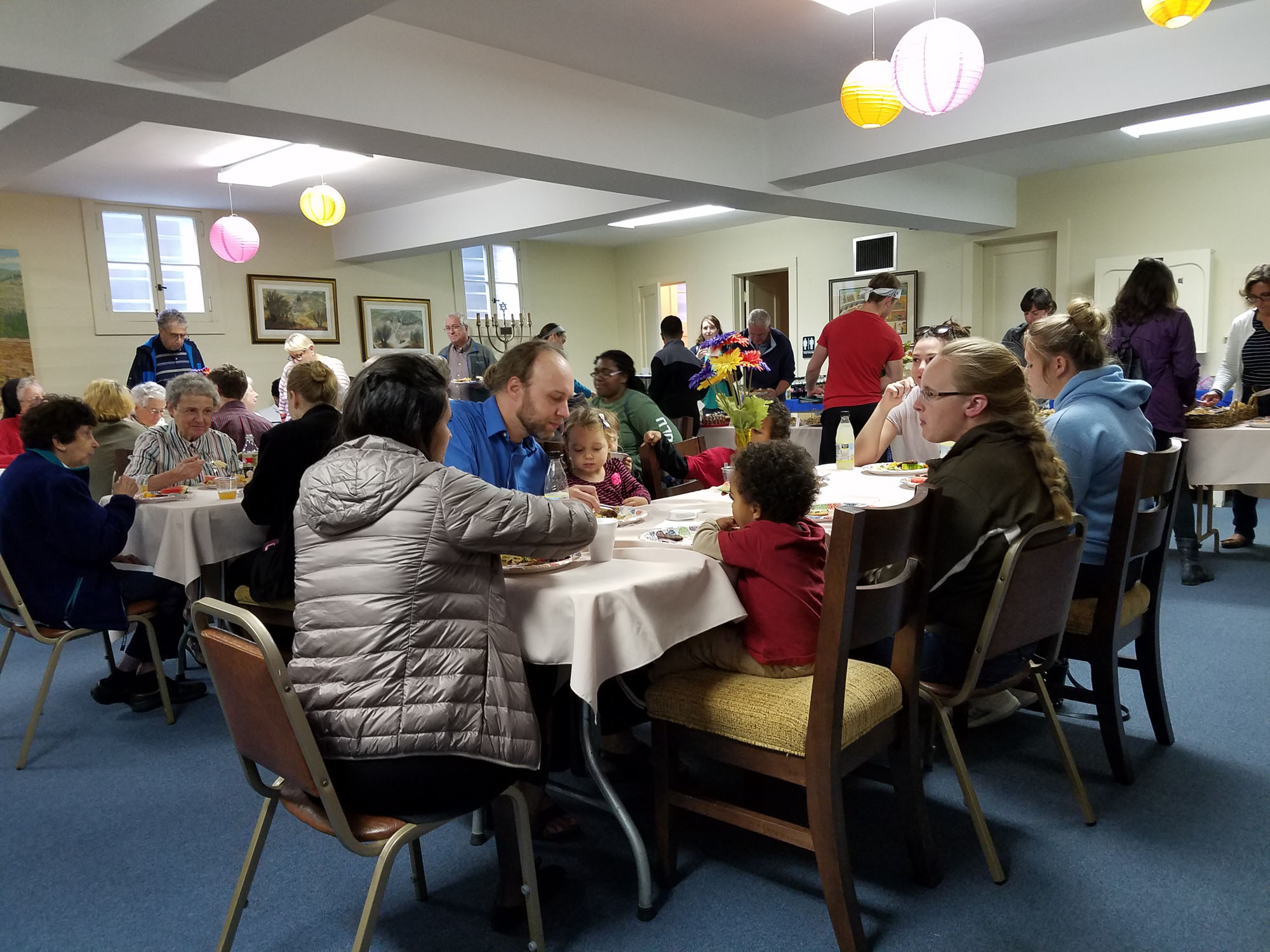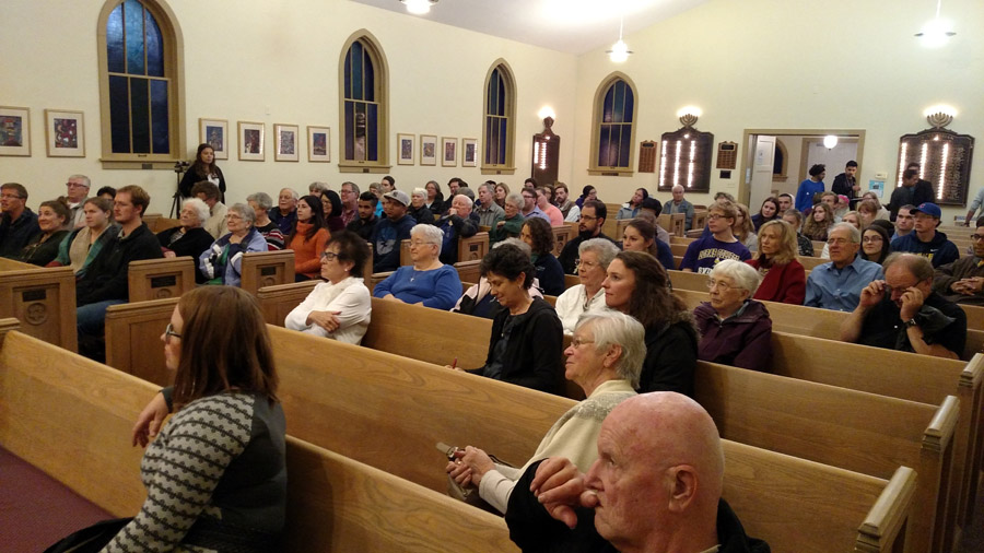 Pictures from our 10-17-19 conversation at Temple Beth El. This was a combination build the Sukkah, service in the Sukkah, dinner in the social hall and conversation. About 90 came for the Sukkah and dinner; 147 were in the Sanctuary for the conversation. Wow. This was a festival of hospitality - CoA folks brought a dish to share in addition to the food prepared by Phyllis Garfield, Ellie Landau and Fern Reinstein. We're not used to seeing our little congregation so packed. Thank you presenters Tauseef Khan, Kerry Brown, Christina Edwards and Kate Scheinman. Topic: Food in your tradition. Participation from a Muslim, Christian/Protestant, Church of Jesus Christ of Latter Day Saints and Jewish perspective.